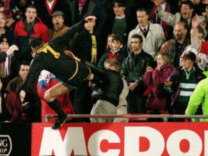 Ma se si pensa a Cantona, la testa vola subito a Selhust Park, stadio del Crystal Palace, e al match di campionato del 25 gennaio 1995: Cantona pressato duro da Shaw, Cantona che commette fallo su Shaw, arbitro che espelle Cantona e…calcio volante da kung fu verso un tifoso del Palace con pugno annesso. Nove mesi di squalifica, multa milionaria da parte del club al giocatore, 120 di servizio sociale da svolgere e titolo che sfuma in favore del Blackburn Rovers. A distanza di anni, il video del calcio, sebbene deprecabile, è cliccatissimo.