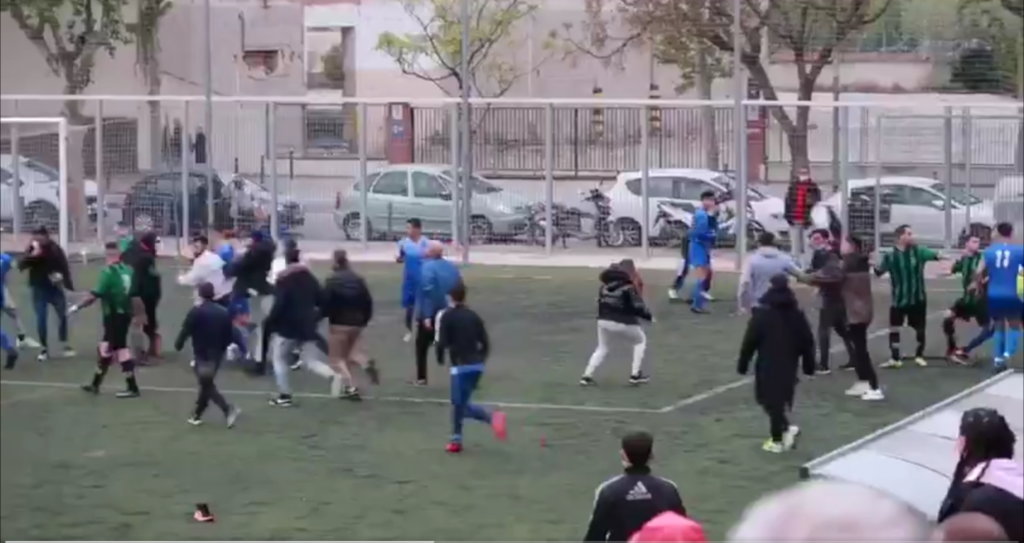 Immagini che non vorremmo mai vedere su un campo da calcio quelle che arrivano direttamente dalla terza categoria catalana. Domenica è andato in scena il match tra Bon Pastor e UD Carmelo, partita che si stava svolgendo senza particolari problemi, prima di una decisione arbitrale che ha fatto scaldare gli animi. Per via di questa, il numero 3 del Bon Pastor, dopo uno scatto di 30 metri, ha deciso di dare un forte spintone ad un giocatore avversario, facendolo finire a terra. L’arbitro ha estratto immediatamente il cartellino rosso, ma a questo punto la rissa esplode del tutto, iniziata da un giovane spettatore entrato in campo per provocare i giocatori del Bon Pastor. Inizia così un tutti contro tutti che coinvolge giocatori, allenatori e spettatori. All’arbitro non resta che sospendere il match, vinto dall’UD Carmelo per 2 a 3.