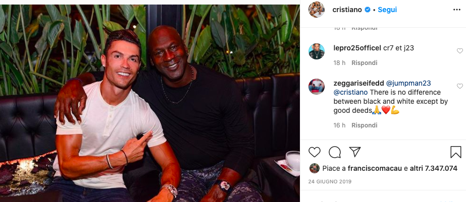 Queste le parole di Cristiano Ronaldo ad un post che lo ritrae in compagnia di un altro campione che in questi giorni lo vede protagonista con l’uscita su Netflix del suo documentario: The Last Dance.