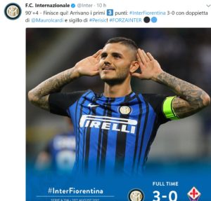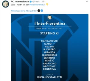 Dopo le vittorie di Roma, Juventus e Napoli, anche la nuova Inter di Spalletti trova la vittoria alla prima di campionato, e lo fa contro una Fiorentina che, oltre a incassare i milioni dal calciomercato per le cessioni dei vari Borja Valero, Bernardeschi e Vecino, incassa anche due pere da un precocissimo Maurito Icardi e il 3-0 da un Perisic non in grandissima forma. Il toscano Spalletti, è proprio il caso di dirlo, ha fatto viola la Viola…